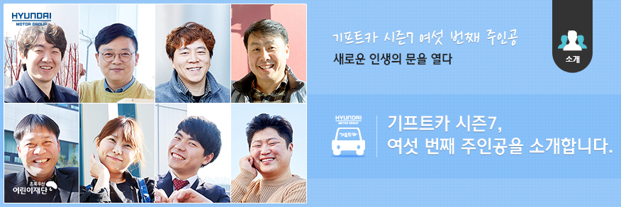 현대자동차그룹 기프트카 캠페인 시즌7의 여섯 번째 주인공들이 탄생했습니다. 새로운 도전을 앞둔 주인공들의 얼굴엔 뜨거운 열정과 의지가 가득합니다. 기프트카와의 만남을 계기로 인생의 터닝 포인트를 맞은 여덟 명의 주인공들을 소개합니다.