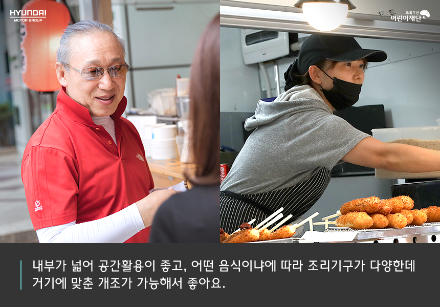 타코야끼를 판매하고 있는 ‘타코와 꽁지’의 김명화 님과 핫도그를 주력으로 한 ‘다미표 핫도그’의 김담희 님은 다용도탑차를 이용하여 푸드트럭을 운영하고 있습니다. 두 주인공 모두 개조를 해서 기프트카를 이용하고 있습니다. “타코야끼는 속까지 익히는데 시간이 걸려요. 그래서 일부러 내부가 넓어 철판을 더 많이 놓을 수 있는 1톤 다용도탑차를 골랐어요. 덕분에 손님이 몰리는 시간에도 한꺼번에 많은 양을 구워낼 수 있답니다.”, “서서 튀겨야 하는 핫도그라 차량의 천정 높이를 최대한 높이고, 하루 종일 지내는 일터인 만큼 제가 편할 수 있게 꾸몄어요.” 또한 2단 접이식 리프트업 도어를 개방했을 때 판넬을 광고판으로 활용할 수 있어 홍보에도 용이하며 내부가 넓으니 식재료와 포장용기 수납 공간도 넉넉하여 사업에 큰 도움이 된다고 귀띔해 주었습니다.