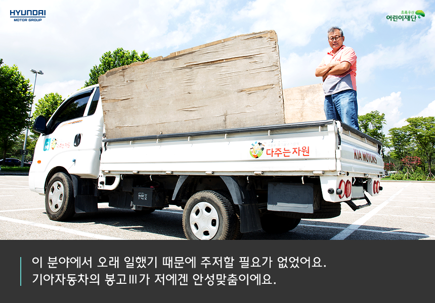 재활용품 수거와 생활폐기물 처리업으로 사업을 운영 중인 서창석 씨는 ‘다주는 자원’의 든든한 사장님입니다. 오랜 기간의 경험으로 창석 씨는 차량 선택에 주저함이 없었습니다. “기프트카는 다양한 종류의 화물차에서 본인에게 맞는 것을 선택할 수 있어요. 하지만 저는 다른 것은 보지 않았어요. 저에게는 봉고Ⅲ보다 더 이상적인 차량은 없었고, 그간의 경험으로도 이미 입증은 충분했죠.” 베테랑의 조언은 계속 되었습니다. “트럭 양쪽으로 튼튼한 널빤지를 대면 짐을 많이 실을 수 있는데다 줄로 묶어 고정시키기 편해요. 차 뒤에 부착할 수 있는 소형 리프트 같은 액세서리가 있으면 짐 싣고 내리기 좋아요.”