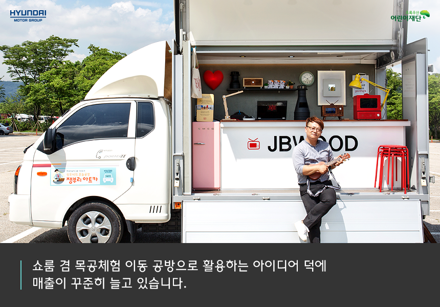 핸드메이드 소품 가구를 제작, 판매하는 ‘쟁부리아트카’의 안성우 씨는 현대자동차 포터Ⅱ 전동식윙바디를 이동용 쇼룸으로 활용하여 홍보 효과를 톡톡히 보고 있습니다. “제품 판매는 온라인 쇼핑몰로 주력하고 기프트카는 전국을 다니며 인테리어 가구를 선보이는 이동용 쇼룸처럼 활용하고 싶었습니다. 그래서 윙부분을 여닫을 수 있는 윙바디를 선택했지요.” 또한 성우 씨는 좋은 손재주를 활용하여 차량 내부를 손수 꾸몄습니다. “테이블을 짜 넣고 핸드메이드 소품 가구를 전시했어요. 차량 아래 부분의 판넬은 목공 체험 테이블로 활용해서 구경만 하는 것이 아닌 체험까지 가능하게 했어요. 위로 올라간 판넬에는 조명을 달아 야간에도 눈에 띄고 분위기 연출에 좋아요.”