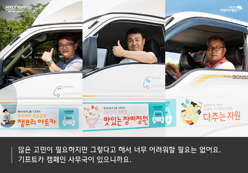 창업 아이템에 따라 선택한 차종도 다르고 각자의 아이디어를 더해 기프트카를 활용하고 있는 시즌7 주인공분들의 이야기를 시작해볼게요.