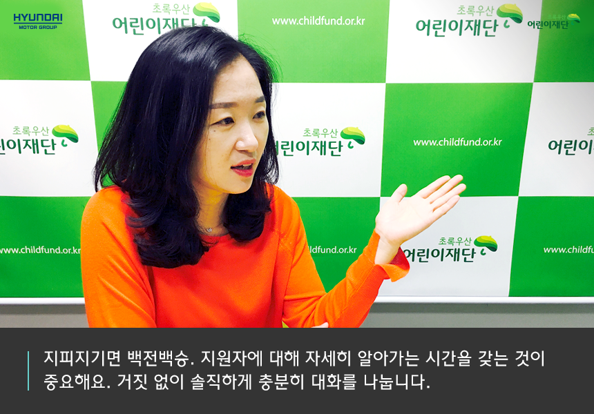 임순경: 대전 시내를 다니다 보면, 3년전 그리고 5년전의 기프트카 주인공 분들의 기프트카를 종종 발견해요. 기프트카 보면서 ‘아, OO 어머님 오늘도 장사가 잘 되시는구나’라고 생각하면서 이분들이 즐겁게 일할 수 있는 터전을 만드는데 도움이 되었다는 생각에 매우 뿌듯합니다. 또 서로의 기프트카를 마주친 주인공분들끼리 ‘초록우산 어린이재단 대전지역본부 임순경 대리님이 추천해주셨어요? 그분한테 감사하다.’라는 말을 나누고 저에게 전해주실 때가 있어요. 당연히 제가 할 일을 한 거라고 말씀 드리면서, 감사 인사를 제가 받을 게 아니라는 생각도 들지만 보람된 마음이 솟아나는 것은 멈출 수가 없네요. (웃음)