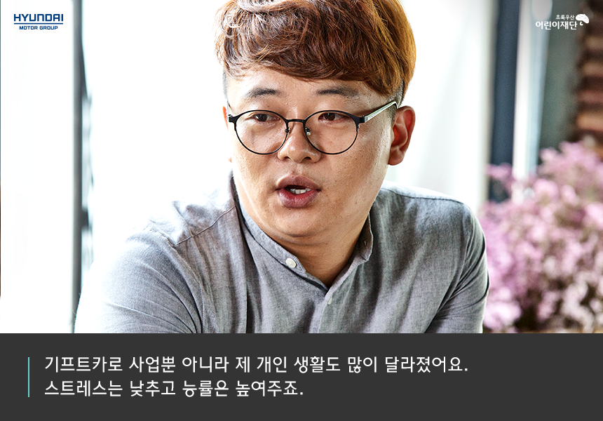 기프트카가 있어서 더 열심히 일을 하게 되는 것 같아요. 마음이 행복하니 일을 더 열심히 하게 되고, 일을 더 열심히 하니 좋은 결과가 발생되고, 좋은 결과로 다시 마음이 행복해지니 선 순환 구조가 만들어지죠. 그래서 기프트카를 행복이라고 표현하고 싶어요. 기프트카 자체만으로 저를 행복하게 만들어 주고 있습니다.