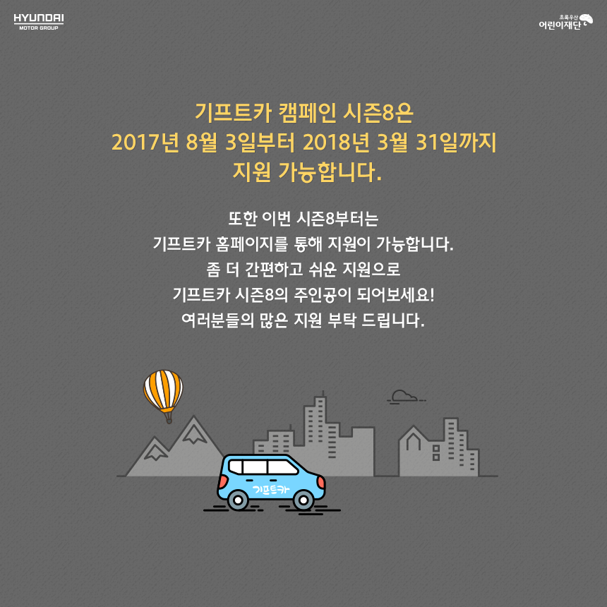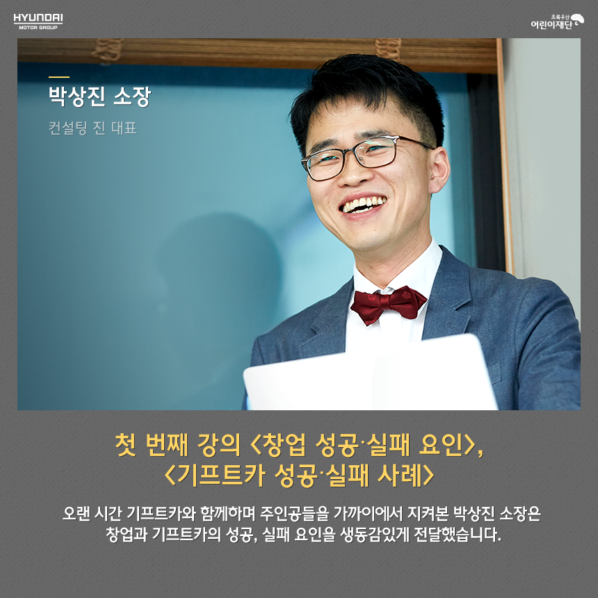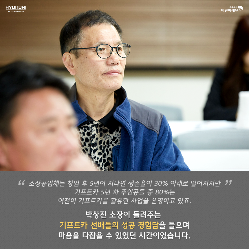 연관 콘텐츠 [SPECIAL] 기프트카 시즌6 주인공 사업 이야기, 그 후 – 서창석 씨 현대자동차그룹 기프트카 시즌8 청년창업 인터뷰 - 김대연 편 【백재훈 씨】 감동을 전하는 뮤직트럭이 여러분을 만나러 갑니다 기프트카 시즌4 오픈 기념 이벤트에 참여하세요! [강승원 님] 탁월한 실력을 자랑하는 욕실 리모델링 전문가가 달려갑니다! 안마 바우처를 통해 터닝 포인트를 맞이한 김창갑 씨의 ‘어울림 안마원’ [유세현 씨] 깨끗하고 신선한 ‘물 만난 수산’을 만나보세요 【유경석 씨】 한결같이 지켜온 고객과의 약속 [2월 희망드림 기프트카] 응원댓글 최종결과 (응원댓글이 종료되었습니다)