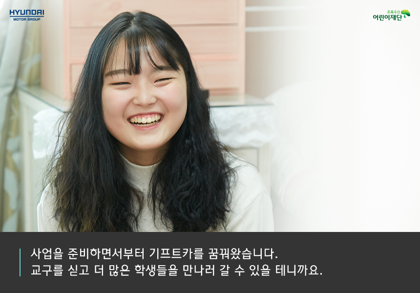아이들에게 교구를 직접 조립하면서 창의력과 꿈을 키울 수 있는 계기를 마련해주고 싶다는 희연 씨는 기프트카라는 듬직한 친구를 얻었습니다. 이제 기프트카로 차량 문제를 해결 할 희연 씨는 매일이 희망으로 가득합니다. 교구를 싣고 이동하며 더 많은 학생들을 만날 수 있고, 다양한 교육기관과 소외계층을 대상으로 교육 프로그램을 진행할 희망으로 말이죠.