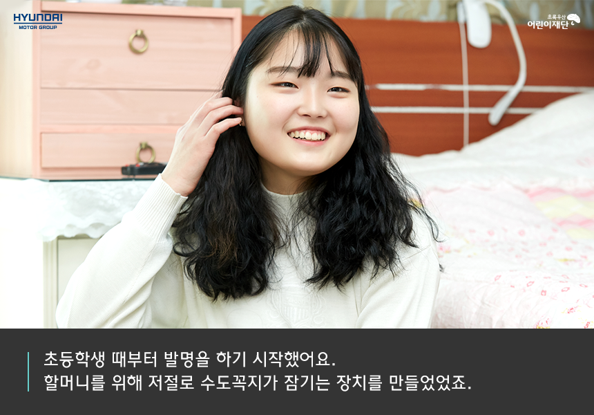 어렸을 적 할머니와 함께 산 희연 씨는 잊지 못한 순간이 있습니다. 수도꼭지가 잠기지 않아 하루 종일 물을 틀어 놓아야 했던 날, ‘물을 쓰지 않을 때 저절로 잠기면 좋겠다’라는 생각을 했고, 곧 발명으로 이어졌습니다. 걱정하는 할머니를 위해 손녀는 발명을 하게 된 것이죠. 이후 희연 씨는 본격적인 발명을 위해 발명 특성화 고등학교에 진학하게 됩니다.