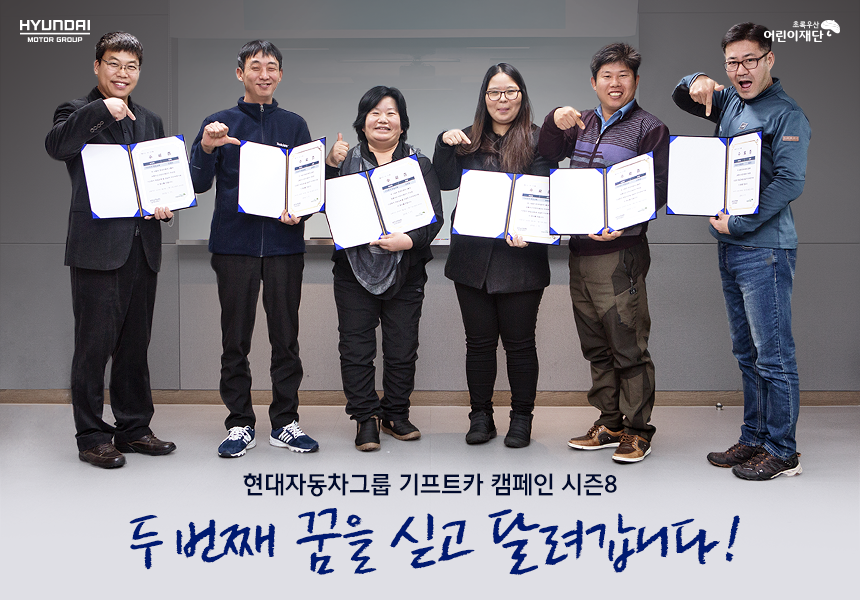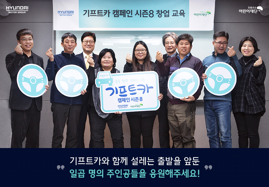 기프트카 캠페인은 차량지원뿐 아니라 창업자금, 창업교육, 컨설팅 지원을 통해 주인공들의 도전이 성공할 수 있도록 맞춤형 창업을 지원합니다. 설렘이 가득한 2018년의 첫 달, 시즌8의 두 번째 주인공들은 2박 3일간의 창업교육을 무사히 마쳤습니다. 축하행사에서는 현대자동차그룹 이병훈 이사와 초록우산 어린이재단의 이충로 본부장이 주인공들에게 응원의 메시지를 전했습니다.