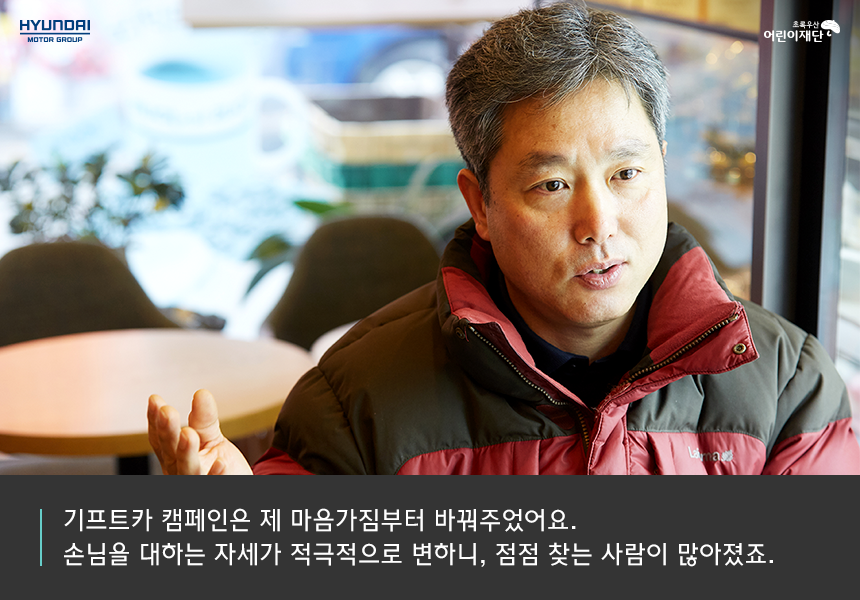 하던 일이 다 잘 안 되어서 채소 장사를 시작했었습니다. 누구보다 성실하고 정직하다고 자부했지만, 장사가 마음처럼 쉽지 않았었죠. 하지만 가장 좋은 먹거리를 꾸준히 제공하다 보면, 언젠가는 사람들이 알아줄 것이라 굳게 믿었습니다. 기프트카 캠페인은 제 믿음이 틀리지 않았다는 것을 증명해주었어요. 제 사업뿐 아니라, 우리 가족의 행복까지 더해준 기프트카 캠페인에 정말 고마운 마음뿐입니다.