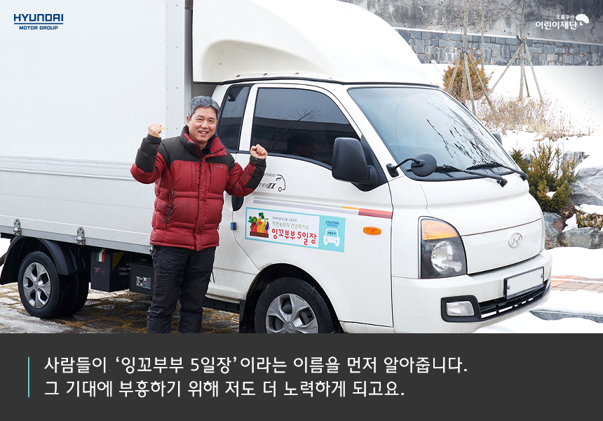 5일장을 다니면서 물건을 팔려면 단골을 만드는 것이 정말 중요합니다. 기프트카에 ‘잉꼬부부 5일장’이라는 이름을 붙이고 다니니, 알아보고 기억해주시는 분들이 많이 생겼어요. 기프트카 캠페인 자체가 인지도가 있으니 신뢰가 저절로 생기고, 이름도 눈에 확 띄어서 그런 것 같아요. 저는 그 기대를 실망시키지 않기 위해 언제나 최고의 모습으로 다가가려 노력합니다. 꼭 저희한테만 사겠다고 찾아오시는 분들도 많아요.