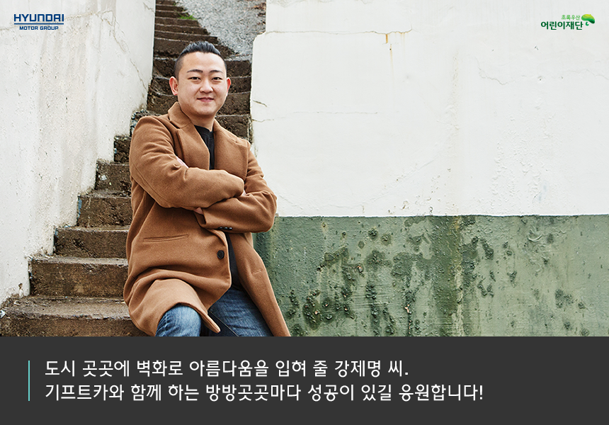 진솔함을 바탕으로 제명 씨는 당당하게 기프트카 캠페인 청년창업의 주인공이 되었습니다. 규모가 큰 장비도 운반할 수 있고, 기동성이 높아지기에 사업을 확장할 수 있는 여유가 생길 것입니다. 또 차량에 드는 비용이 준 만큼 직원도 고용할 수 있고 더 많은 벽화 작업을 할 수 있죠. 앞으로는 경남 지역을 넘어 전국으로 그리고 해외까지 제명 씨의 벽화가 진출 되는 꿈을 현실로 만들 수 있을 것입니다.