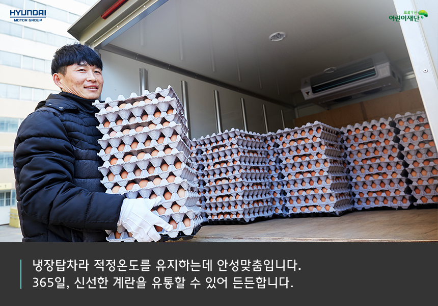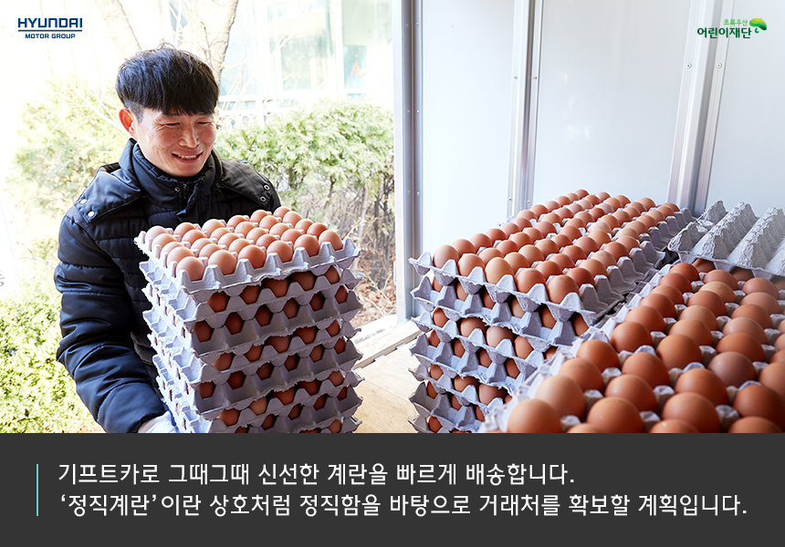 제 기프트카는 냉장탑차라 계란을 신선하게 배송하기에 안성맞춤입니다. 그동안 무더운 여름에는 계란이 상하지 않을까, 추운 겨울에는 계란이 얼어버리지 않을까 걱정이 많았습니다. 이젠 적정온도를 유지해 365일, 신선한 계란을 유통할 수 있어 정말 든든합니다. 또 차량 적재 공간이 넉넉해 많은 양의 계란을 싣고 운반할 수 있어 마음에 듭니다.