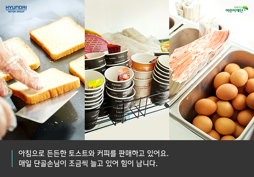 이른 아침, 출근길에 나서는 직장인과 건축 현장 근로자를 대상으로 토스트와 커피, 어묵을 판매하고 있어요. 간편하지만 따뜻하고 든든하게 배를 채울 수 있는 메뉴들이라 인기가 좋아요. 새벽 4시 30분에 일어나 정성껏 재료를 준비해야 해 몸은 고단하지만, 단골손님이 하나 둘 늘고 있어 즐거운 마음으로 영업하고 있어요.