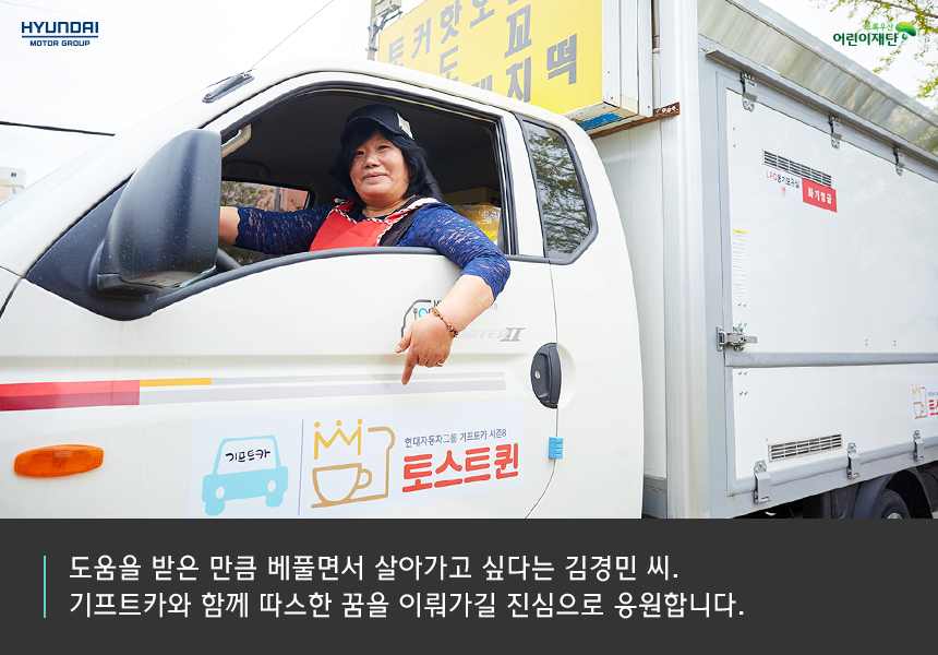 기울어진 가계를 바로 세우고, 사랑하는 아이들과 밝은 미래를 그려가고 싶어요. 아이들이 하고 싶은 일을 하면서 행복하게 살아가면 좋겠습니다. 마지막으로 기프트카 캠페인을 통해 커다란 도움을 받은 만큼 저도 베풀면서 살아가고 싶어요. 이웃과 나누는 삶을 실천할 수 있도록 열심히 살겠습니다.