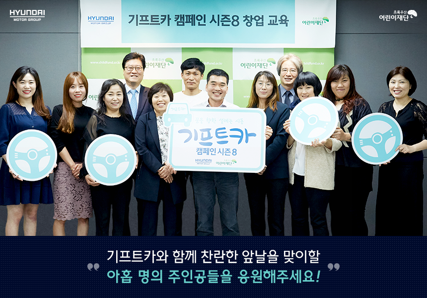 기프트카 캠페인은 차량 지원뿐 아니라 창업자금, 창업교육, 컨설팅 지원을 통해 주인공들의 도전이 성공할 수 있도록 맞춤형 창업을 지원합니다. 기프트카 캠페인 시즌8의 마지막 차수인 다섯 번째 주인공들은 긴장과 설렘을 안고 2박 3일간의 창업교육을 마쳤습니다. 주인공들의 수료를 축하해주기 위해 현대자동차그룹의 이병훈 이사와 초록우산 어린이재단의 이충로 본부장이 참석해 주인공들에게 응원의 메시지를 전했습니다.