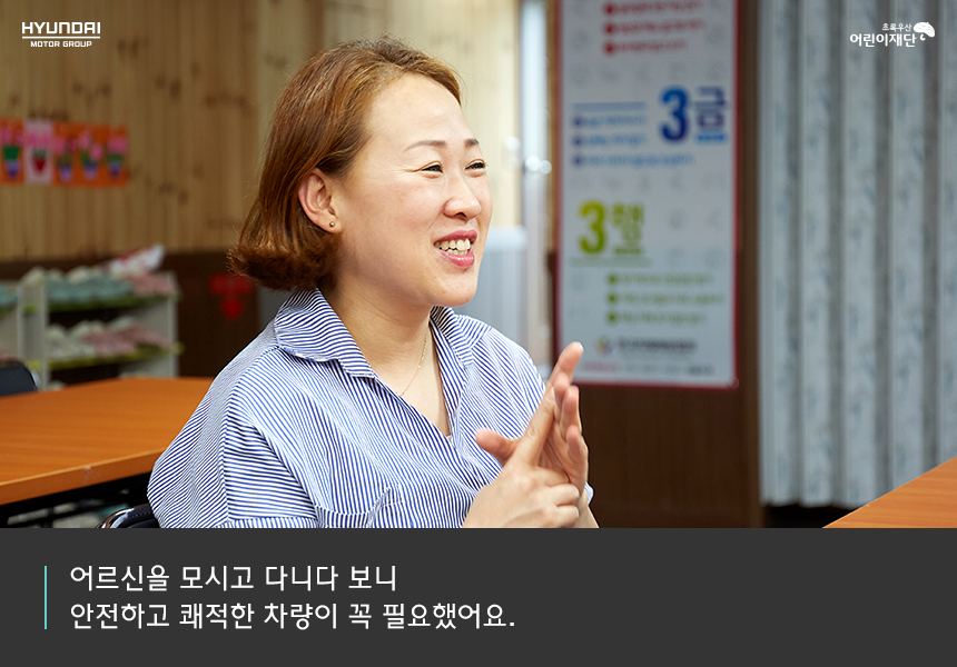 어머님, 아버님들이 정말 좋아하셨어요. 처음 차량을 받아온 날 안전 운행을 바라는 고사를 지냈는데, 교육생 어르신 50분도 한자리에 모였답니다. 그 날 정말 기뻤어요. 여유가 생긴 만큼 어르신들과 더 깊이 교감할 수 있겠다는 확신이 들었기 때문이에요. 그것이 더 유용하고 행복한 교육을 제공하기 위한 조건이라고 생각하거든요.