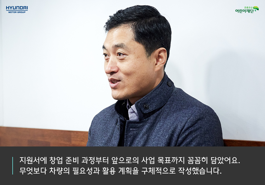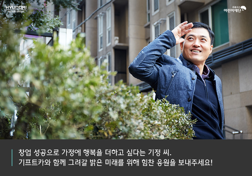 고민이 깊어가던 어느 날, 지인을 통해 기프트카 캠페인을 알게 되었습니다. 사업용 차량과 자금, 창업교육, 컨설팅을 지원해준다는 얘기를 듣고 저를 위한 절호의 기회라 생각했습니다. 희망의 길을 발견하자 ‘나도 할 수 있다’는 용기가 생겼습니다. 기프트카 주인공의 꿈을 품고 찬찬히 지원 서류를 작성하기 시작했습니다.