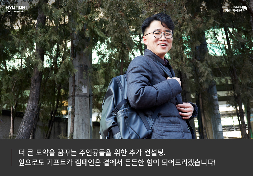창업 컨설턴트로서 도움을 드리는 입장이지만, 열정 넘치는 주인공분들을 통해 인생을 배우고 있기도 합니다. 좌절을 극복하고 새롭게 도전하는 주인공들의 모습을 보며 많은 것을 느끼고, 긍정적인 에너지를 얻습니다. 이제껏 그래왔듯 앞으로도 기프트카 캠페인을 발판 삼아 멋진 인생을 살아가시길 바랍니다. 늘 여러분의 도전을 진심으로 응원하겠습니다.