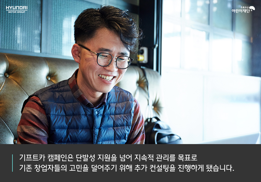 기프트카 캠페인은 주인공으로 선정된 분들에게 차량을 지원할 뿐만 아니라 창업자금, 창업교육, 컨설팅 지원 등 창업 성공의 발판을 지원하고 있습니다. 특히 컨설팅은 창업 분야에 전문성을 갖춘 컨설턴트가 직접 현장을 방문해 상세한 창업 컨설팅을 지원합니다. 이번에는 특별하게 이전 시즌 창업자를 대상으로 한 추가 컨설팅이 진행하였다고 하는데요, 2011년부터 기프트카 캠페인과 함께한 ‘컨설팅 진’ 대표 박상진 소장을 통해 알아보겠습니다!