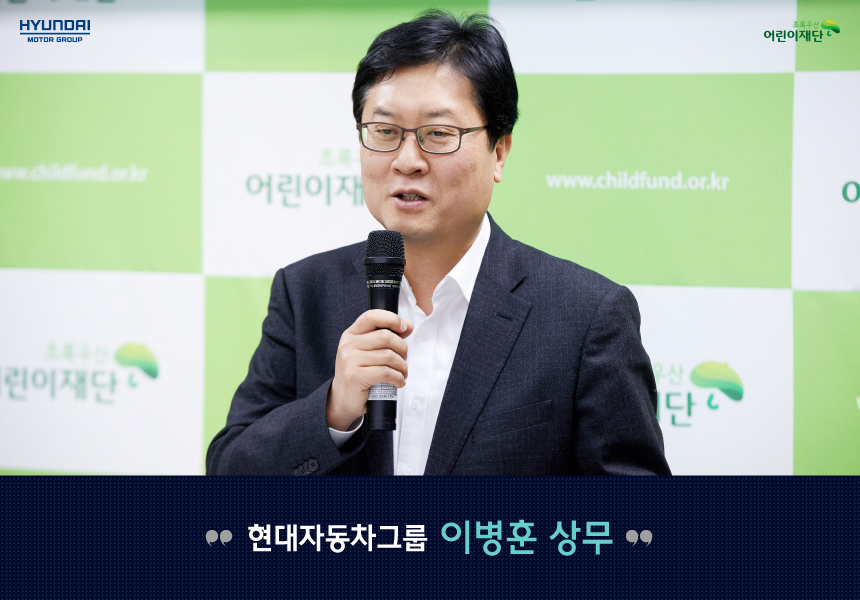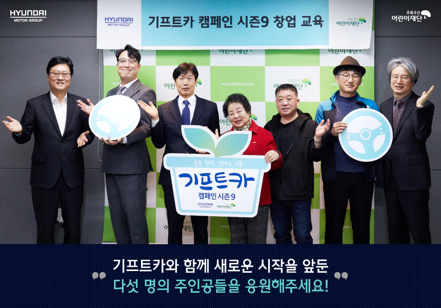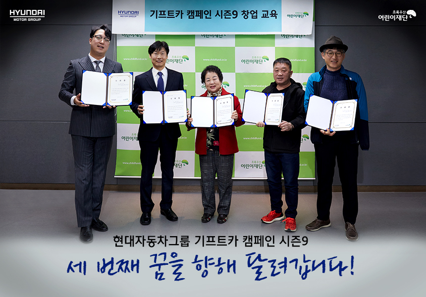 기프트카 캠페인은 차량 지원뿐 아니라 창업자금, 창업교육, 컨설팅 지원을 통해 주인공들의 도전이 열매 맺을 수 있도록 맞춤형 창업을 지원합니다. 차가운 공기 속에 따스한 햇볕이 가득했던 지난 2월, 기프트카 캠페인 시즌9의 세 번째 주인공들이 2박 3일간의 창업교육을 마쳤습니다. 주인공들을 축하하기 위해 수료식장을 찾은 이병훈 현대자동차그룹 상무와 이충로 초록우산 어린이재단 본부장이 축하 메시지를 전했습니다.