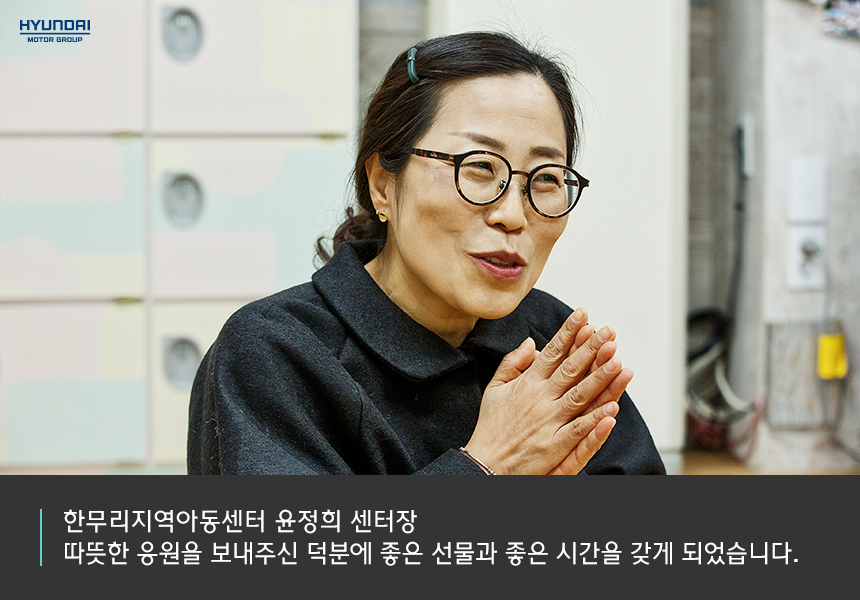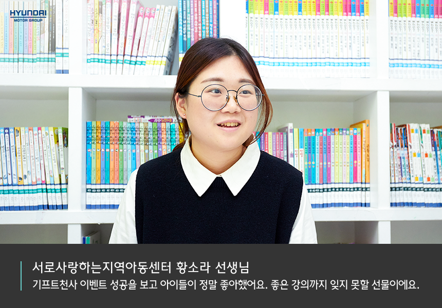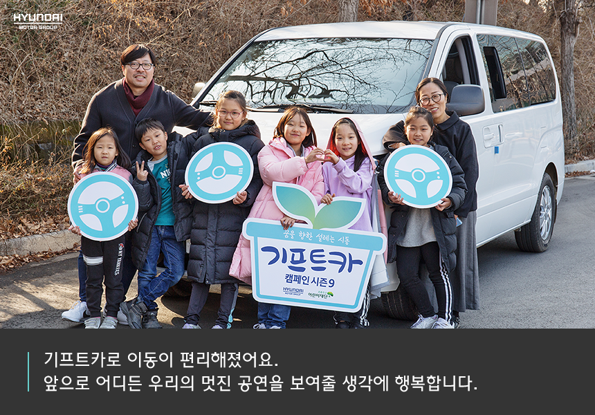 마지막으로 윤정희 센터장은 기프트카 덕분에 교육의 질이 달라졌다며 또 한 번 감사하다는 말을 꺼냈습니다. 특히 이동에 제약이 사라져 다양한 체험학습을 진행할 수 있게 되었다고 합니다. 그리고 아동·청소년 오케스트라단 친구들도 지역에 구애 받지 않고 공연을 펼칠 수 있게 돼 행복한 나날을 보내고 있다고 합니다.