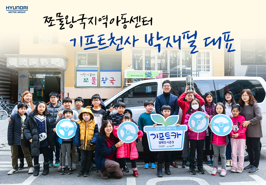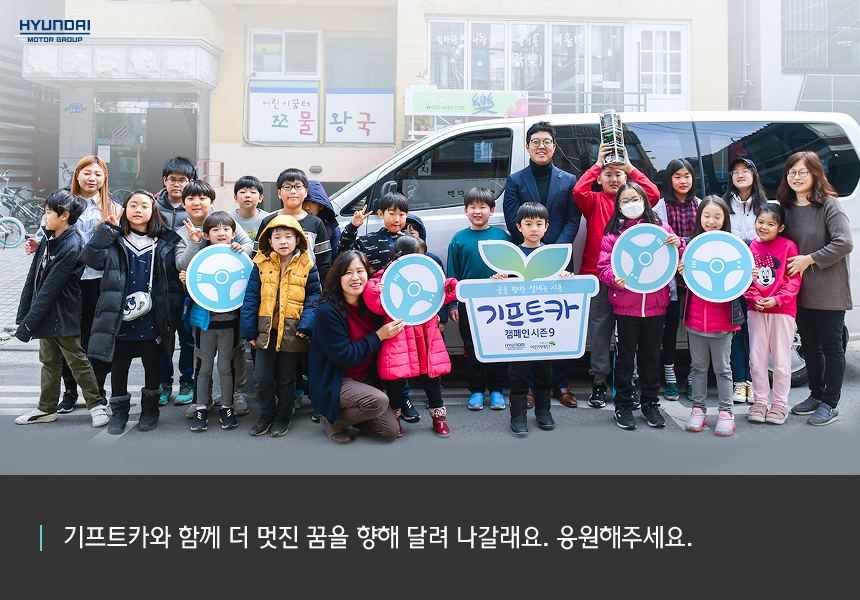 기프트카 캠페인 시즌9에서 새롭게 선보인 ‘우리동네 기프트카 캠페인’이 ‘기프트팩 증정’, ‘찾아가는 기프트천사 이벤트’로 마무리하면서 성공적으로 진행되었습니다. 사연을 통해 소개된 10곳의 지역아동센터에 기프트카와 함께 기프트팩을 지원했고, 수만 개의 응원 메시지에 힘입어 1일 꿈 교사 특강이 찾아갔습니다. 우리동네 기프트카 캠페인에 보여주신 높은 관심과 함께해주신 모든 분께 감사 인사를 드립니다. 우리동네 기프트카 캠페인은 마무리 되었지만, 앞으로도 현대자동차그룹은 아이들의 꿈과 미래를 위해 힘찬 응원을 함께 하겠습니다.