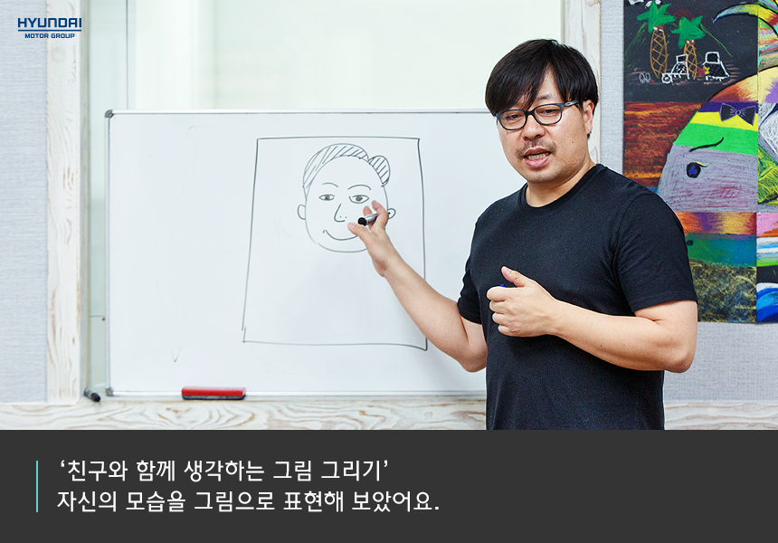 심재원 작가는 ‘친구와 함께 생각하는 그림 그리기’를 주제로 강의를 시작했는데요. 아이들은 자신을 찬찬히 관찰하고, 생각해보며 자화상을 그려나갔습니다. 악기로 자신을 표현하던 아이들이 오늘은 그림을 통해 자신을 나타내보게 된 것이죠. 수업이 시작되자 장난꾸러기 같던 아이들이 진지한 얼굴로 도화지를 채워나갔습니다. 자신의 모습을 그림으로 표현한 아이들은 마지막으로 자신의 꿈을 짧은 글로 담아내는 시간을 가졌습니다.