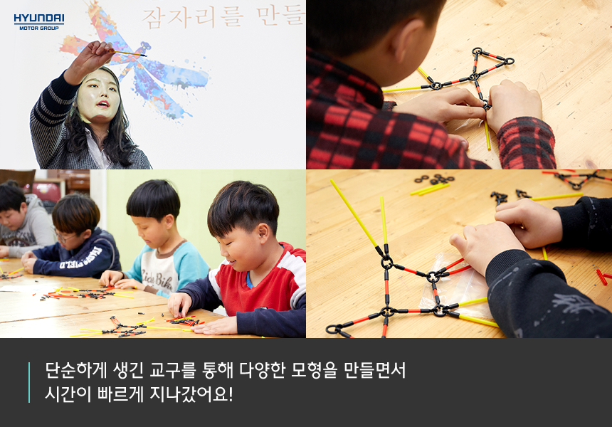 연희연 대표는 직접 개발한 창의 학습 교구를 소개하고, 꿈처럼 멀리 날아갈 수 있는 잠자리 모형을 만들어 보자고 했습니다. 연희연 대표의 지도에 따라 아이들은 다양한 형태의 교구를 서로 맞추고, 연결하기 시작했습니다. 아이들은 따로 또 같이, 자신만의 잠자리 모형을 만들어 나갔는데요. 마침내 잠자리를 완성한 아이들은 무척 자랑스러운 얼굴로 자신이 만든 모형을 뽐냈습니다.