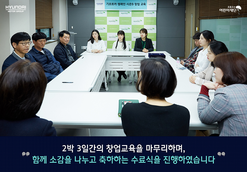 기프트카 캠페인은 차량 지원뿐 아니라 창업자금, 창업교육, 컨설팅 지원을 통해 각 주인공 상황에 맞는 맞춤형 창업을 지원합니다. 새로운 계절의 시작을 알리던 2019년 3월, 기프트카 캠페인 시즌9의 네 번째 주인공들이 2박 3일간의 창업교육을 마쳤습니다. 교육 수료식에는 임정은 팀장을 비롯한 초록우산 어린이재단 관계자들과 김진아 창업 컨설턴트가 참석해 주인공들을 축하해주었습니다.