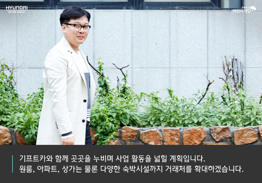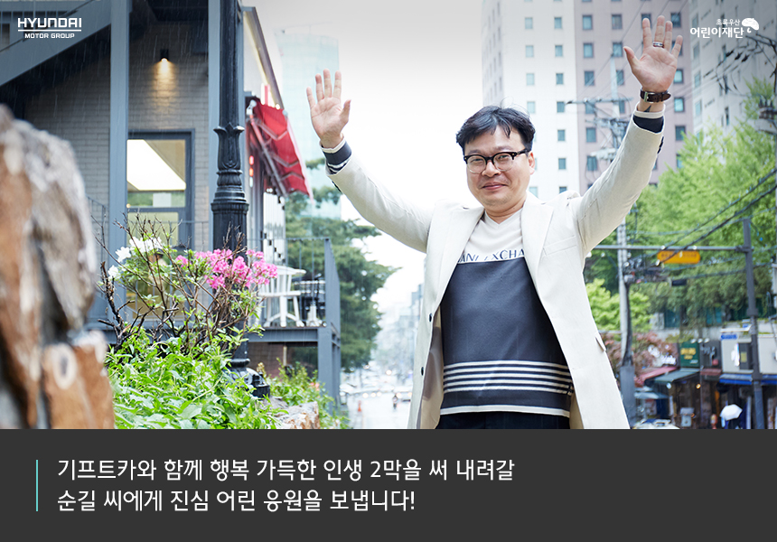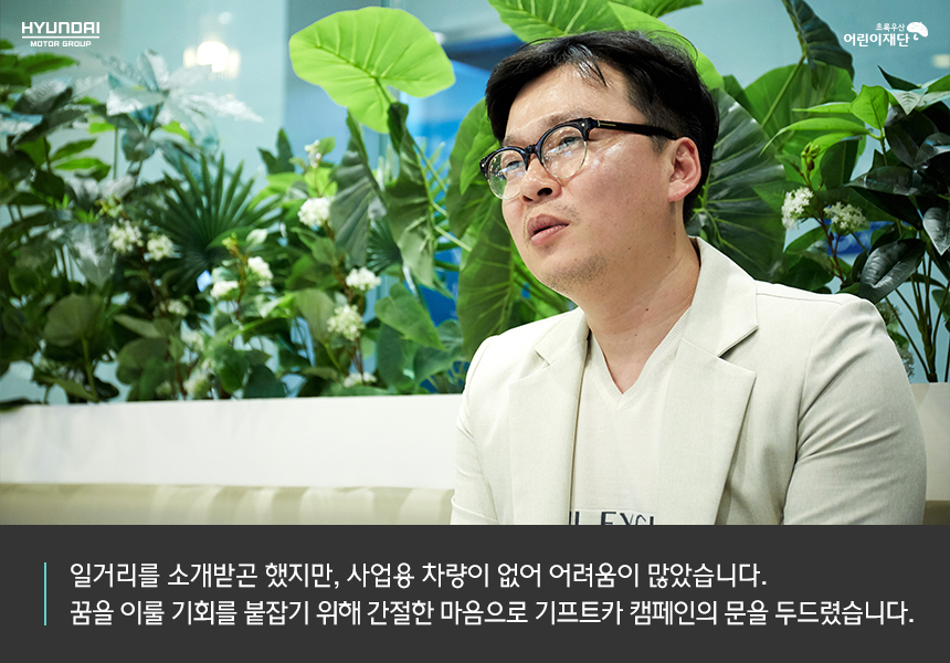 이번 기프트카 캠페인 시즌9의 주인공에 선정돼 정말 기쁘고 감사합니다. 덕분에 새로운 인생으로 나아갈 힘과 용기를 얻었습니다. 기프트카 캠페인을 통해 사업에 성공해 아이에게 멋지고, 자랑스러운 아빠의 모습을 보여주고 싶습니다.