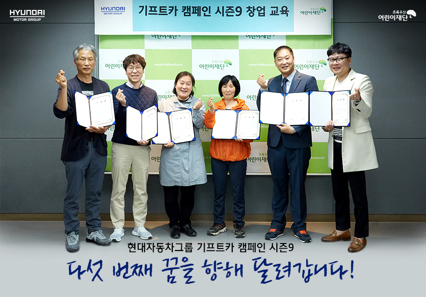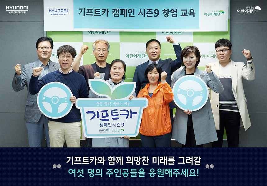 현대자동차그룹과 초록우산 어린이재단이 함께하는 기프트카 캠페인 시즌9의 다섯 번째 주인공들을 소개합니다. 남다른 의지로 창업의 꿈을 키워온 여섯 분이 새롭게 기프트카 캠페인 시즌9과 인연을 맺게 되었는데요. 기프트카 캠페인 시즌9과 함께 새로운 도약을 꿈꾸는 주인공들의 이야기와 설렘 가득했던 축하 행사 현장을 소개해 드리겠습니다.