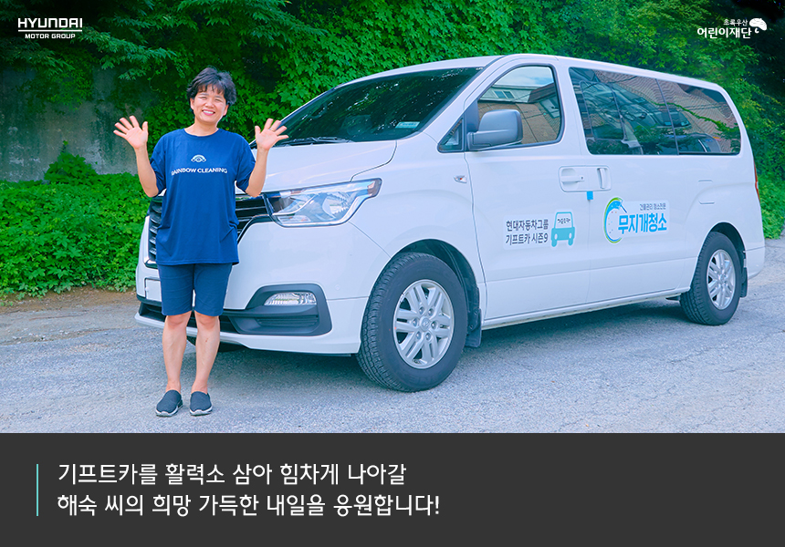 해숙 씨는 기프트카 캠페인을 만나고 삶이 긍정적으로 바뀌었다고 말합니다. 새로운 내일을 꿈꿀 수 있는 희망과 든든한 삶의 기반이 생긴 덕분이라는데요. 어느 때보다 반짝 반짝한 미래를 그려가고 있는 해숙 씨에게 응원을 보냅니다!