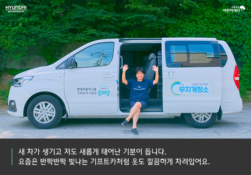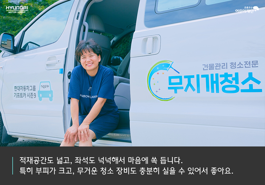 가슴이 벅차도록 행복합니다. 사업용 차량이 생긴다는 것만으로도 기쁜데, 새 차라니 더할 나위 없이 좋습니다. 새 차에 흠집이라도 날까 엄청나게 애지중지하고 있어요. (웃음) 제 기프트카는 스타렉스 5밴이어서 적재공간도 넓고, 좌석도 넉넉해서 마음에 쏙 듭니다. 특히 부피가 크고, 무거운 청소 장비도 충분히 실을 수 있어서 정말 좋아요. 예전 차량은 공간이 좁아 운반에 제약이 많았거든요. 사업에 꼭 맞는 기프트카가 생겨서 정말 든든합니다.
