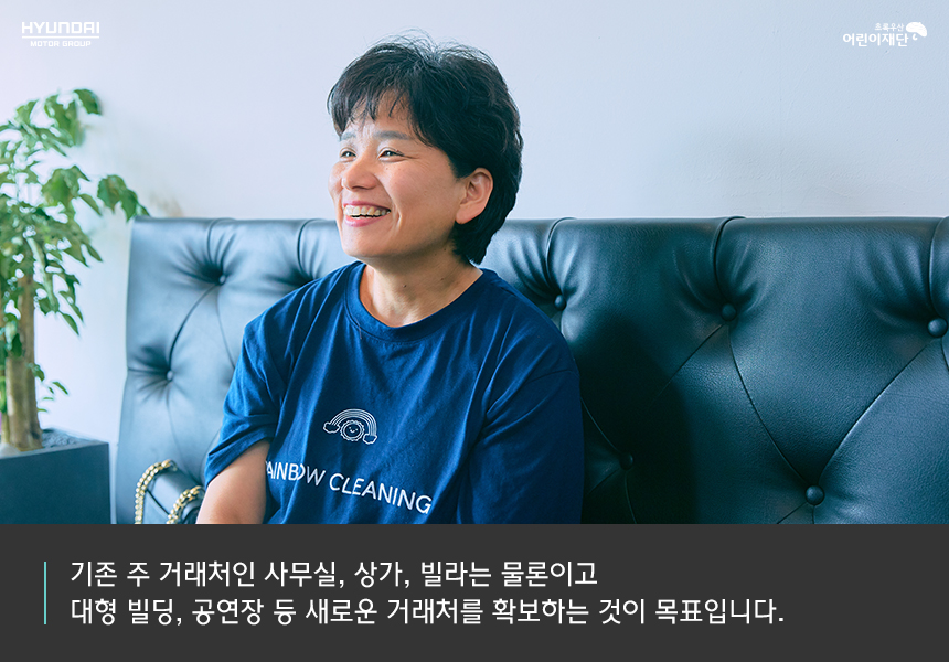 우선 거래처를 늘리는 것이 가장 큰 목표입니다. 기존 주 거래처인 사무실, 빌라는 물론이고 빌딩, 공연장 등 새로운 거래처를 확보할 계획입니다. 다양한 종류의 청소 기계와 약품을 마련해 전문적인 청소 서비스를 제공하려 합니다. 그리고 사업이 안정되면, 기술을 배우고 싶은 사람들에게 배움의 기회를 주고 싶습니다.