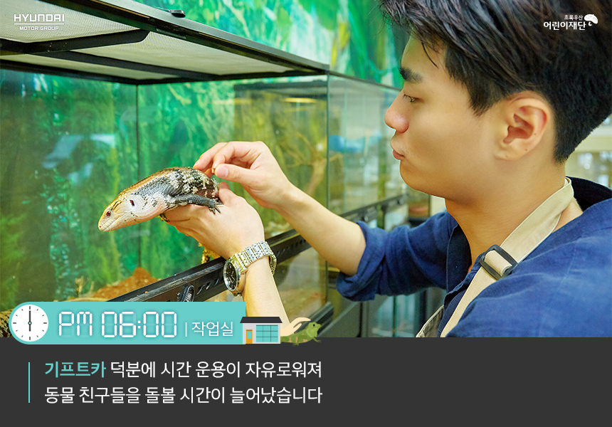 (웃음) 다행히 기프트카가 생기고 유연하게 시간을 운용할 수 있게 돼 동물 친구들을 돌볼 시간이 늘어났어요. 전보다 더 자주, 세심하게 들여다볼 여유가 생겼답니다. 그리고 혹시 동물 병원에 갈 일이 생기더라도 크고 무거운 사육장을 거뜬히 실을 기프트카가 있어 든든하죠. 전용 사육장과 함께 이동하면 동물들의 스트레스를 최소화한 상태에서 안전하게 이동할 수 있어 안심됩니다.