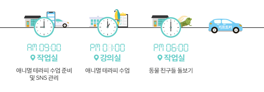 기프트카를 타고 작업실에 출근해 애니멀 테라피 수업 준비를 합니다. 먼저 교육 커리큘럼 기획안을 점검하고, 직접 제작하는 교육용 교재나 팸플릿도 꼼꼼하게 확인해봅니다. 그리고 수업 진행에 필요한 미술용품과 부자재 등을 빠짐없이 챙겨 차에 실어 둡니다.