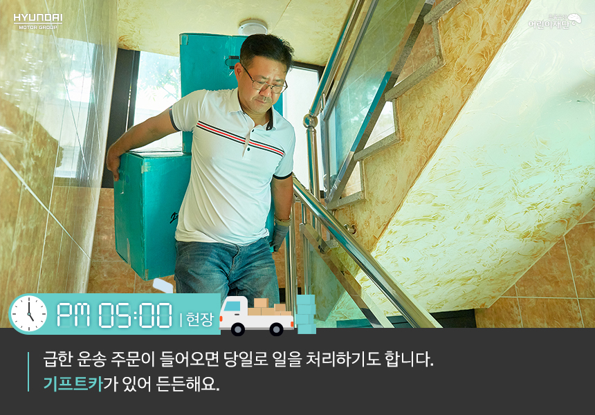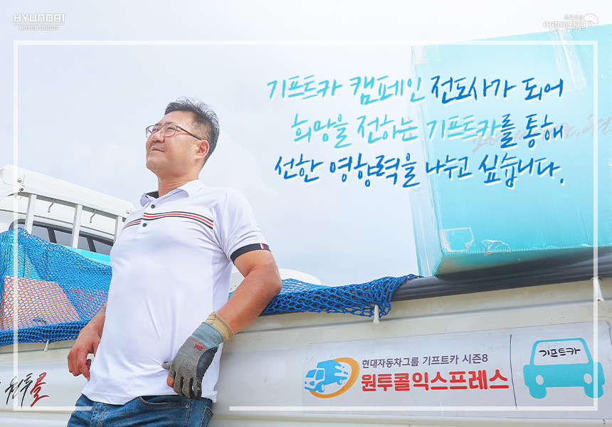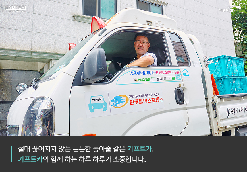 소형 이삿짐 센터를 운영하며 물류운송을 합니다. 기프트카는 그 자체로 사업 밑천이 되어주었어요. 기프트카가 없었다면 사업을 시작하기 힘들었을 거예요. 기프트카 캠페인으로 제공받은 1톤 트럭이 사업에서 핵심적인 역할을 담당하고 있으니까요.