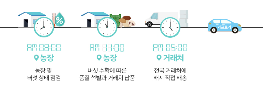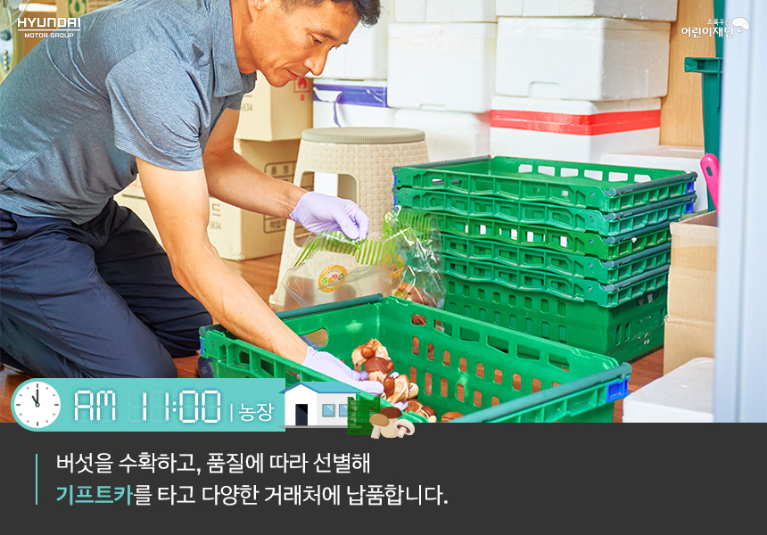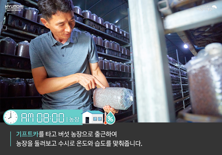 기프트카를 타고 버섯 농장으로 출근하자마자 농장을 둘러보며 배지와 버섯 상태를 체크합니다. 버섯은 온도, 습도, 조도, 환기 등 재배 환경에 굉장히 예민한 작물이기 때문에 수시로 생육환경을 확인하고 조정해야 합니다. ‘농작물은 주인의 발소리를 듣고 자란다’는 말처럼 자주 들여다볼수록 좋은 품질의 버섯을 수확할 수 있기 마련입니다.