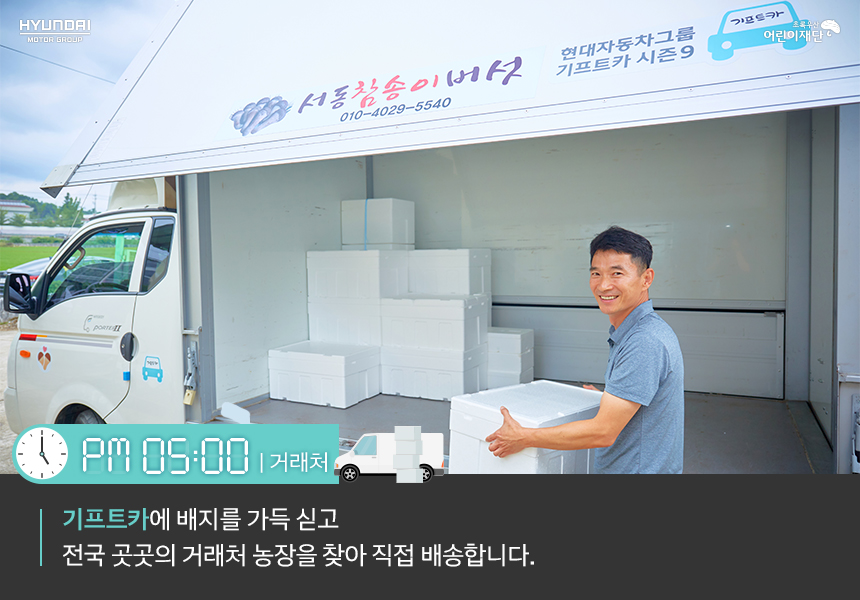 버섯이 온도에 예민한 작물이라 해가 뜨거운 시간을 피해 거래처 농장에 배지를 배송합니다. 예전에 포터 트럭을 이용할 때는 지붕이 없어 날씨 영향을 많이 받았던 데다 적재한 박스들이 떨어질까 매번 밧줄로 동여매는 일이 무척 고되었는데요. 안전하게 물건을 실어 나를 수 있는 기프트카가 생긴 뒤로는 그런 걱정과 수고를 말끔히 덜게 되었습니다.