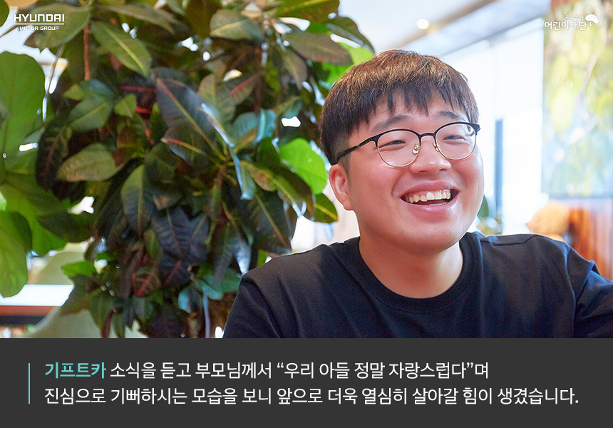 처음 선정 소식을 듣곤 어안이 벙벙했어요. 드라마 주인공처럼 소리를 지르거나, 방방 뛰며 신나 할 줄 알았는데 저는 되레 멍하더라고요. 꿈인가 생시인가 싶었죠. (웃음) 그런데 부모님이 엄청나게 기뻐하시는 모습을 보고 나니 제 마음도 벅차오르더라고요. 특히 어머니께서 “우리 아들 정말 자랑스럽다. 앞으로 뭘 해도 잘할 거라 믿는다”라고 응원해주셔서 정말 큰 힘이 되었습니다. 최근 부모님 두 분 다 건강이 안 좋으셔서 웃을 일이 줄었는데 기프트카 덕분에 집안 분위기까지 밝아졌습니다. 앞으로 더욱 열심히 노력해서 가족들과, 기프트카 캠페인 관계자분들에게 성공하는 모습을 꼭 보여드리고 싶습니다.