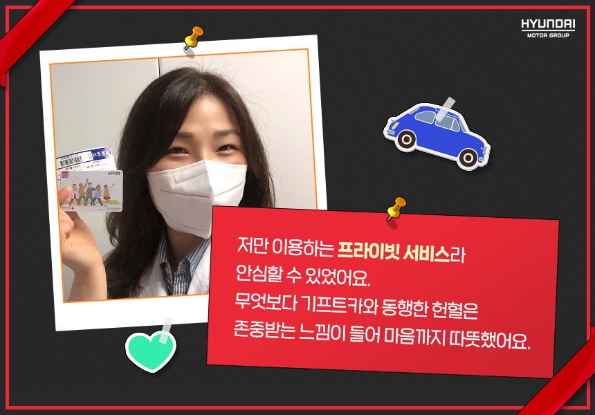 얼마 뒤 또 한 번 기프트카를 신청해 헌혈을 다녀올 만큼 만족도도 높았어요. 앞으로 더 많은 분들이 기프트카 레드카펫과 함께 헌혈에 동참했으면 좋겠습니다.