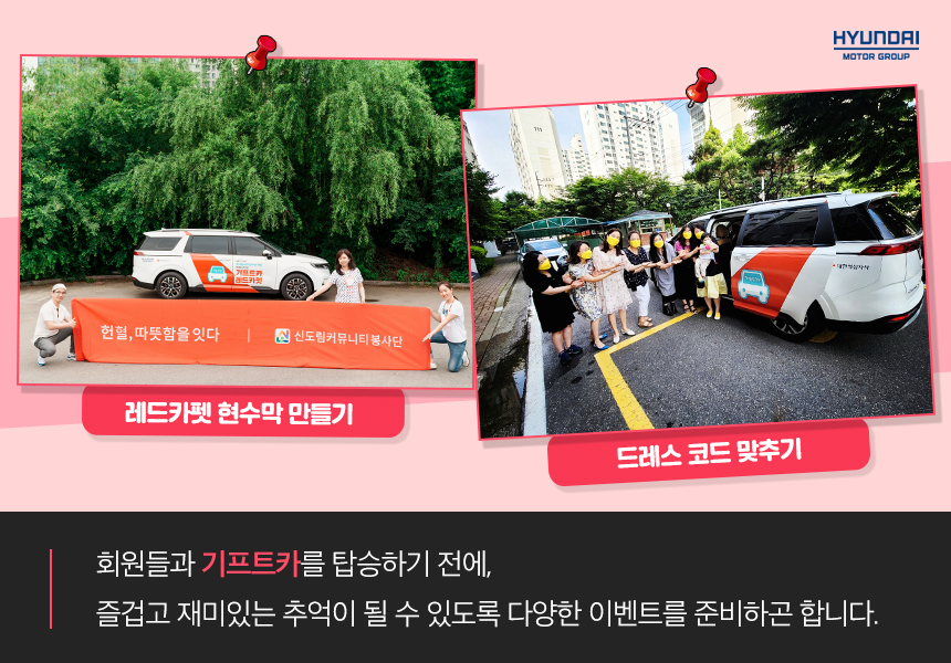 A. 김진양 님 : 헌혈 모임이 즐거운 이벤트가 될 수 있도록 멤버들과 많은 준비를 해요. 기프트카마다 애칭을 정하고, 레드카펫 현수막도 제작하고, 드레스 코드까지 맞춰요.