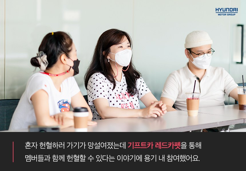 A. 이현아 님 : 헌혈을 실천하고 싶은 마음은 있지만, 혼자 헌혈의 집을 찾기가 두려웠어요. 근데 마침 커뮤니티 운영자분이 기프트카 레드카펫 캠페인을 소개하며 같이 참여해보자고 글을 올리셨더라고요. 함께할 사람이 생기니 자신감이 생겨 신청하게 됐어요.