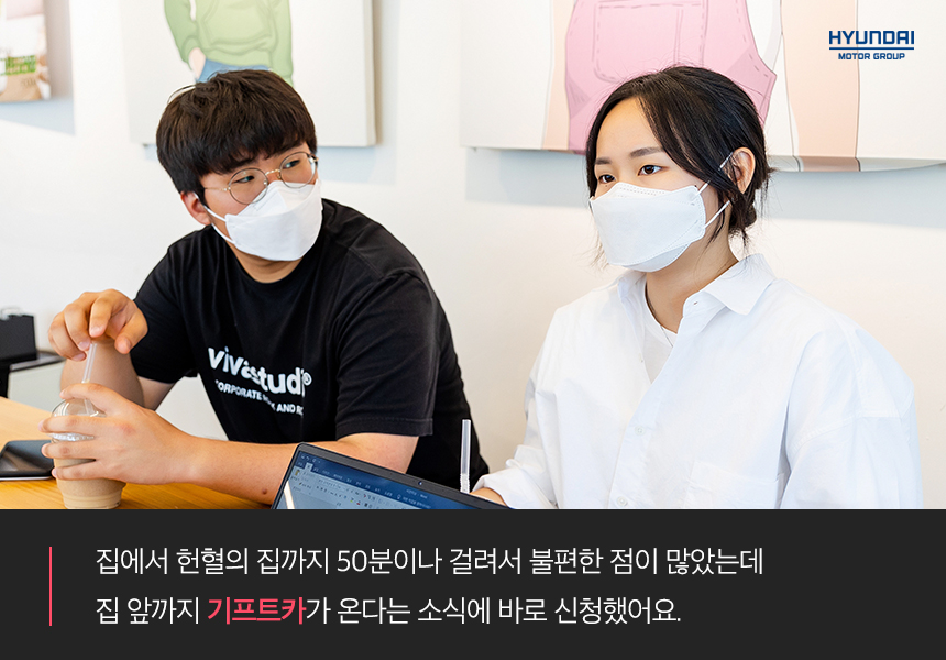 A. 서연지 님 –고등학교 동창인 준형이와 6년째 헌혈의 집을 함께 다니고 있는데요. 얼마 전 친구와 헌혈 약속을 잡은 날, 신기하게 대한적십자사에서 기프트카 캠페인 참여 안내 문자가 왔어요. 사는 지역에 헌혈의 집이 없어 대중교통으로 50분 정도 이동해야 하는데 집 앞으로 기프트카가 온다니 망설일 이유가 없었죠. 당장 기프트카 홈페이지에서 사연을 신청해 참여하게 됐어요.
