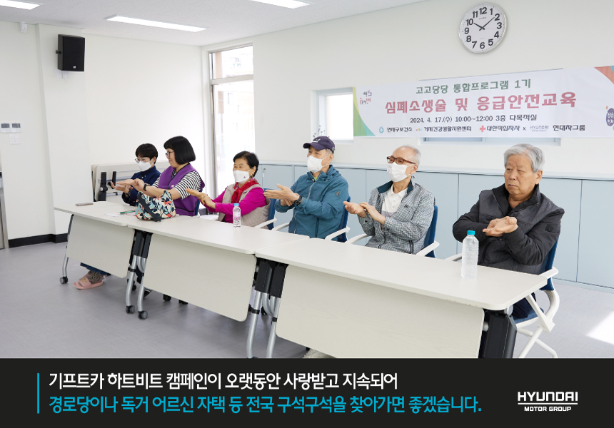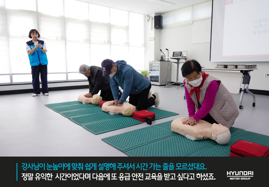 A. 어르신들께 기프트카 하트비트 캠페인을 설명드리면서 응급 안전 교육을 지원받을 예정이라고 말씀드렸는데요. 처음엔 “현대자동차에서 응급 안전 교육을 한다고?”라며 신기해하시다가 “동네까지 찾아와 준다는데 당연히 배워야지, 언제 또 이런 기회가 오겠노?” 그러시더라고요. 어르신들이 기대했던 것 이상으로 좋아해 주시고, 적극 참여하겠다고 말씀까지 주셔서 신청하길 정말 잘했다는 생각이 들었습니다.