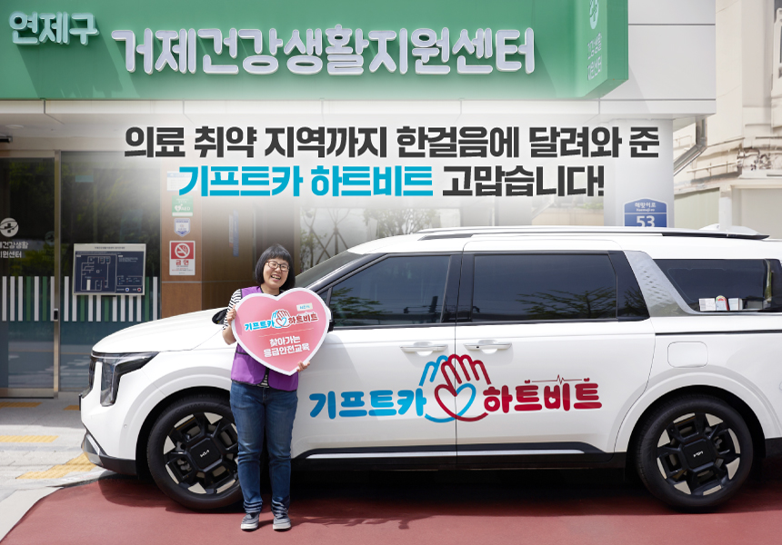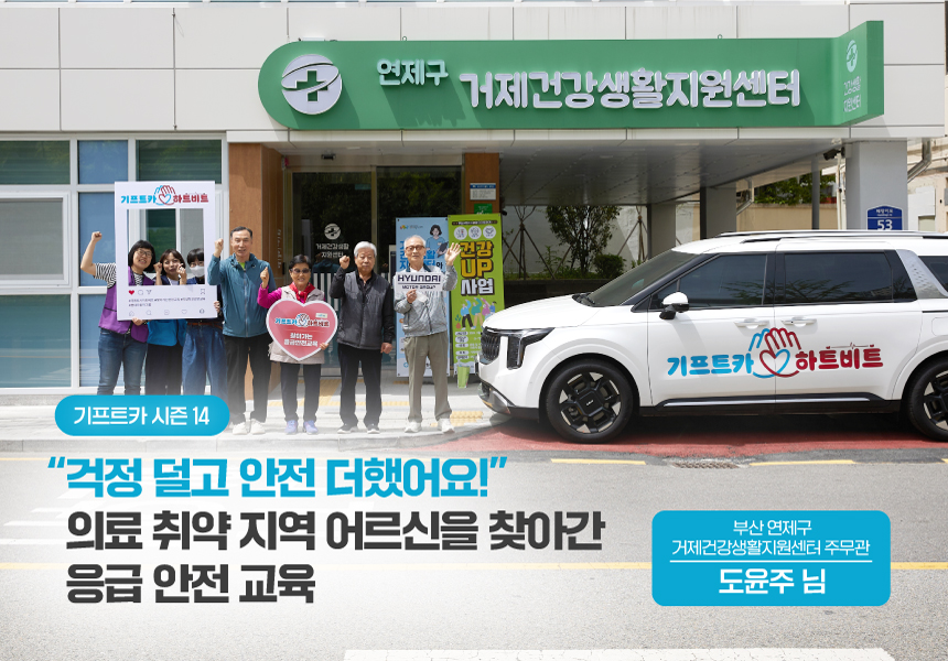 기프트카 하트비트 캠페인이 두 번째로 달려간 곳은 부산 연제구 거제 4동에 위치한 ‘거제건강생활지원센터’입니다. 이곳은 연제구 거주 인구 대비 의료 기관 수가 제일 적은 의료 취약 지역인데요. 간단한 혈당 검사조차 여의찮은 실정이라 센터 주무관인 도윤주 님은 응급 상황 가능성에 늘 촉각을 곤두세울 수밖에 없었다고 합니다. 이번 기프트카 하트비트를 통해 어르신들과 함께 응급 안전 교육을 이수한 도윤주 님은 한결 마음이 놓인다며 환하게 웃어 보였는데요. "걱정은 덜고 안전은 더했다"라는 도윤주 님의 교육 후기를 지금 들려드립니다.