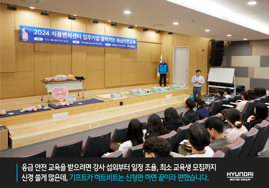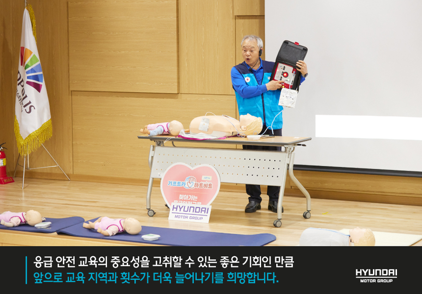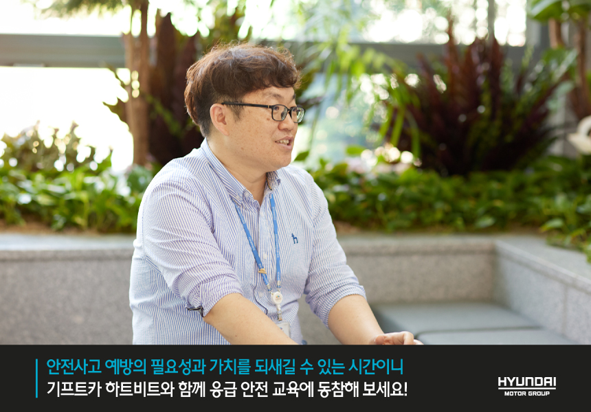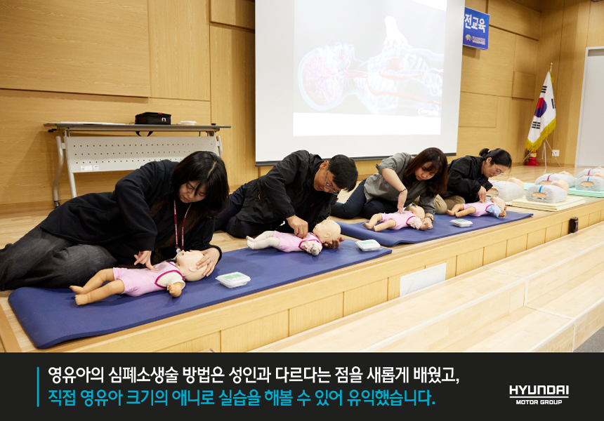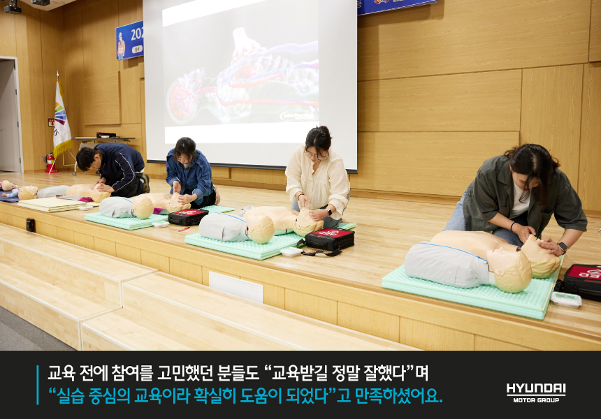 A. 응급 안전 교육이 열린다고 공지를 드렸을 때, “교육받으면 분명 좋긴 할 텐데, 바빠서 참석할 수 있을지 모르겠어요” 라는 반응이 많았습니다. 다들 업무가 바쁘다 보니 따로 시간을 내는 게 부담스러우신 거죠. 그래서 현대자동차그룹에서 지원하는 응급 안전 교육이라며 참여를 권유해 드렸더니, 기대보다 많은 분들이 관심을 갖고 참여해 주셨는데요.