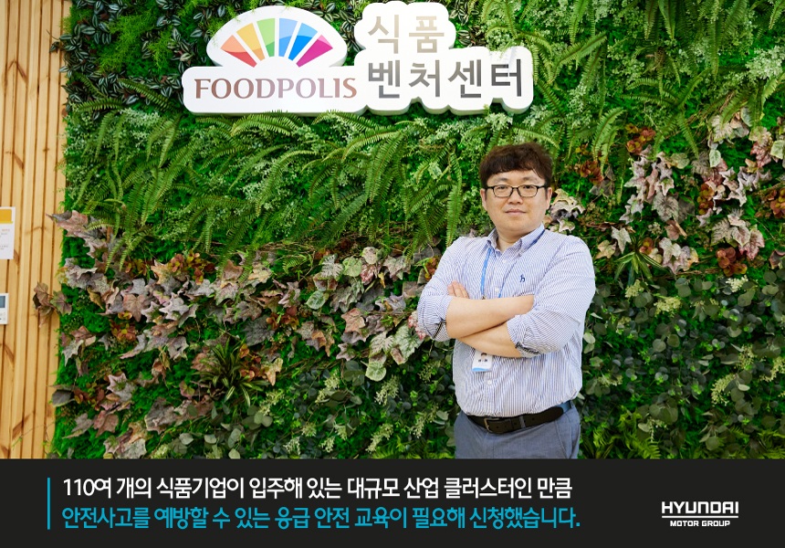 A. 안녕하세요, 전북 익산 한국식품산업클러스터진흥원에서 벤처창업 성장 지원 업무를 담당하는 이창수 팀장입니다. 이곳은 110여 개의 식품기업이 입주해 식품산업의 미래가치를 창출하고 있는 대규모 산업클러스터입니다. 입주기업이 많은 만큼 근로자 안전을 최우선으로 강조하며 안전 교육을 정기적으로 실시하고 있는데요. 올해도 응급 안전 교육을 진행하려고 알아보던 중, 기프트카 하트비트를 접하고 신청하게 됐습니다.