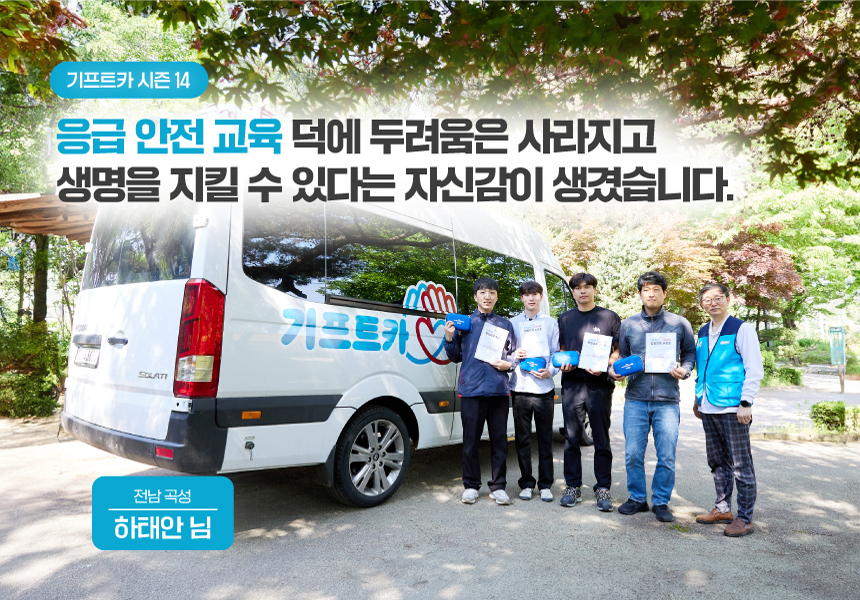 우리 사회에 안전을 더하기 위해 전국 곳곳을 누비는 기프트카 하트비트! 오늘은 현대 쏠라티 차량이 움직이는 응급 안전 교실이 되어 전북 익산으로 향했습니다. 주인공 하태안 님과 직장 동료들은 쾌적하고 여유로운 공간에서 원하는 시간에 교육받을 수 있었다며 만족감을 표했는데요. 응급 상황에 대한 막연한 두려움이 생명을 지킬 수 있다는 자신감으로 거듭났던 교육 현장을 지금 만나보시죠!